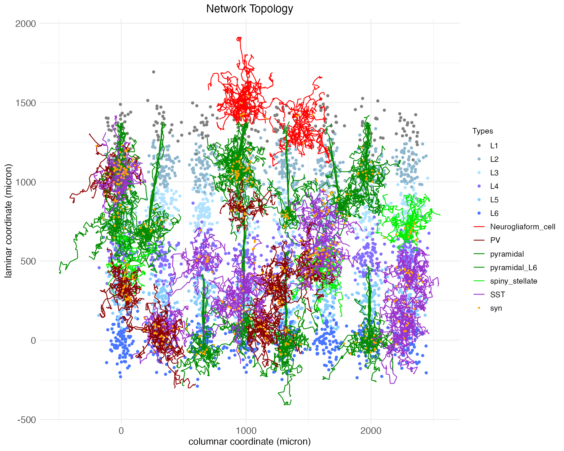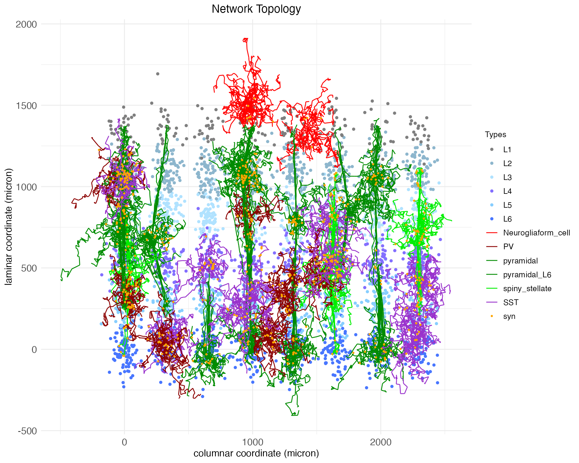 By default, the plot.network function plots all cell bodies as dots, colored by layer, and plots the arbors for a random 1% of those cell bodies, colored by cell type. Synapses (syn) are plotted as dots. The synapses shown are determined by the presynaptic axons that are plotted. Notice that the arbors shown are mostly small and compact, expect for the pyramidal neurons, which have long apical dendrates which extend upwards.